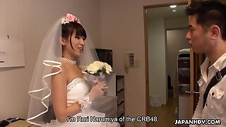 Naughty and fairly big-chested Japanese bride Emi Koizumi gives a good blowjob