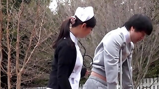 Hardcore outdoor plumbing with a Japanese nurse wearing lingerie